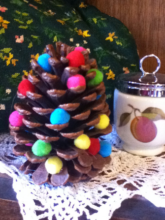 松ぼっくりにカラフルなポンポンボールをつけただけのシンプルツリー。なんだかほっこりさせてくれる。
