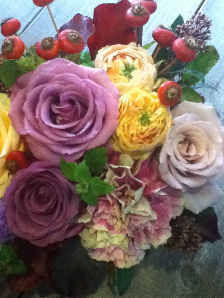 バラの実を使ってアレンジを作ってみました。私好みの色のバラをたくさん入れて、カーネーションも