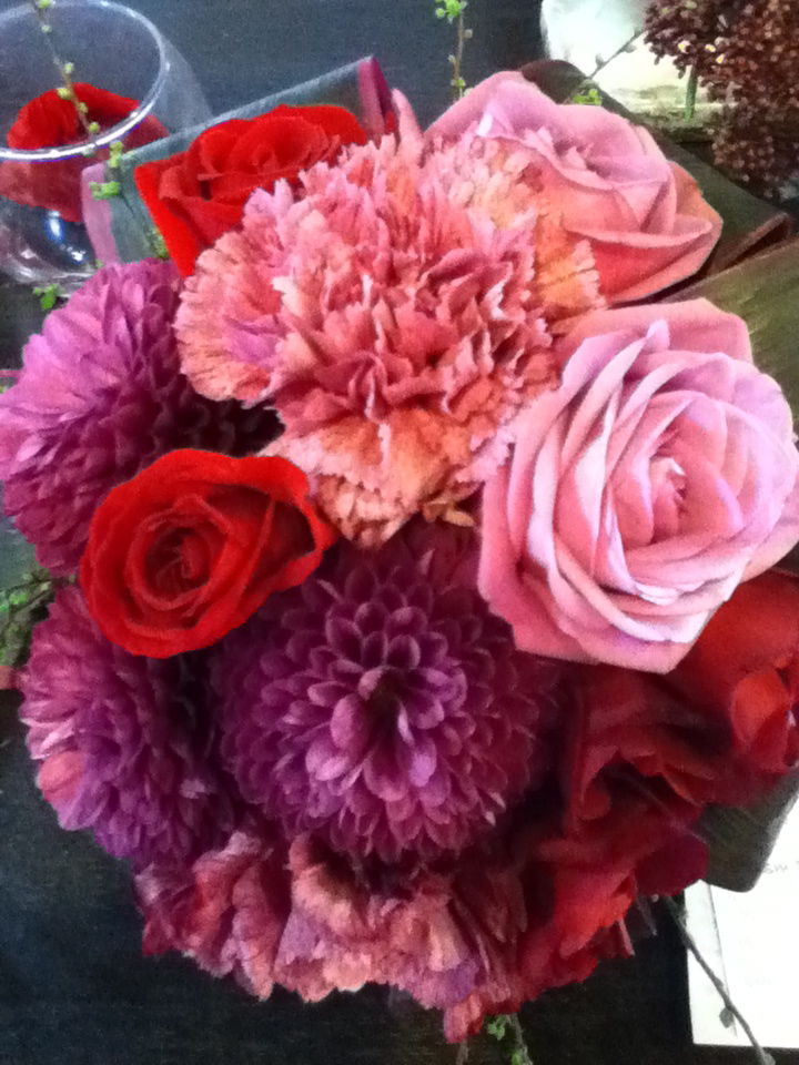 上の写真のブーケ風の花束は私がなんとなく作りたくなって作ったものです。きれいなピンポンマムがあったのでそれを活かした花束を作りたくなったのです。写真ではわかりにくいのですが実物は「かなりエンジ色の渋い」花束です。赤っぽくとかピンク系のご注文はよくありますが、「エンジ色」というのは