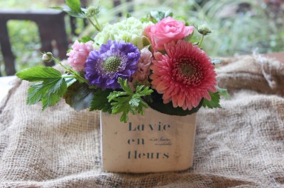 本日のアレンジです。この器かわいいと思いませんか?実はこれ植木鉢なんです。なのでお花が終わった後は植木鉢としてお使いいただけます。ガーデニングのお好きなお母さん、きっと喜ばれると思います。
