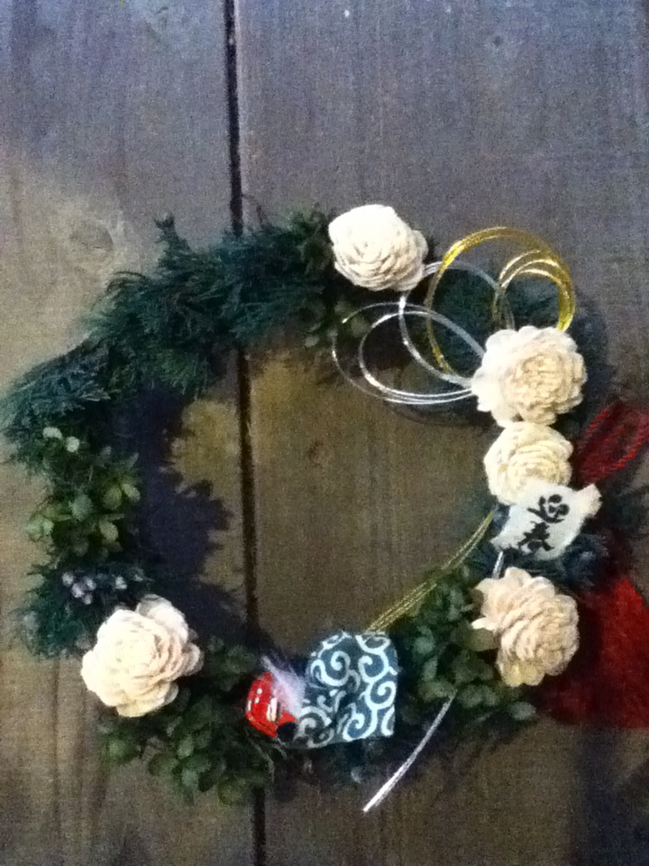 こちらはレッスン料、花材費込みで3000円です。レッスンの時間などはご相談ください。お一人様でも大丈夫です。1時間弱で仕上がります。お正月用のオーナメントのついてます。