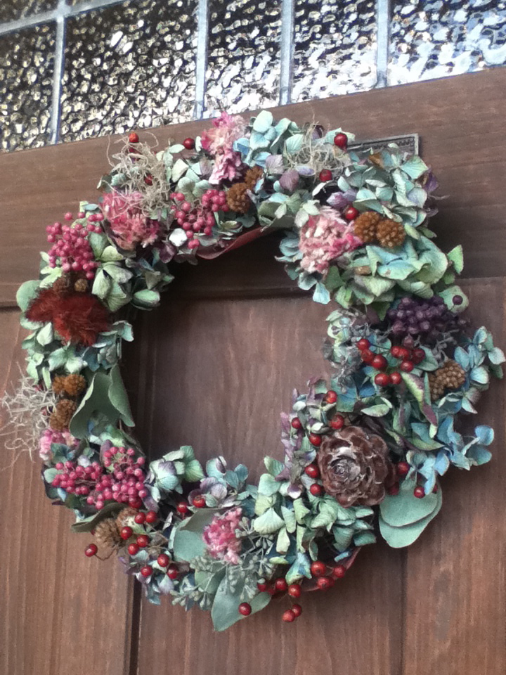 秋色あじさいとたっぷりの実ものを使ったドライフラワーのリースです。ちまたにはたくさんの既製品のリースがリーズナブルなお値段で出回っておりますが、もしそれを自分の手で作ってみたら・・・?とても愛おしい世界でたった一つのリース、なんだかいつも見慣れた光景が違ってみえそうじゃないですか?
