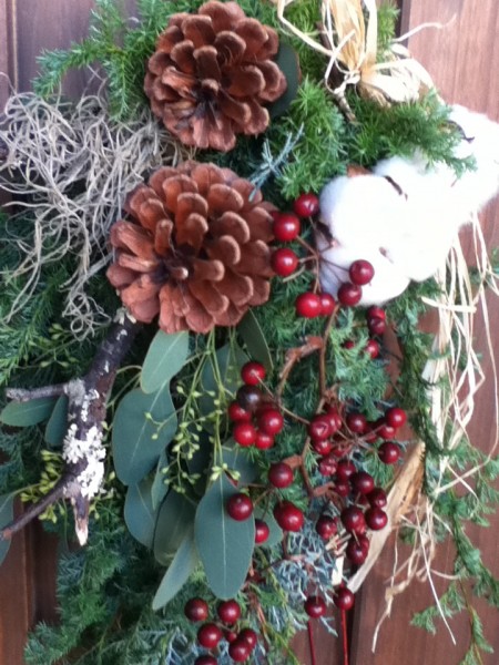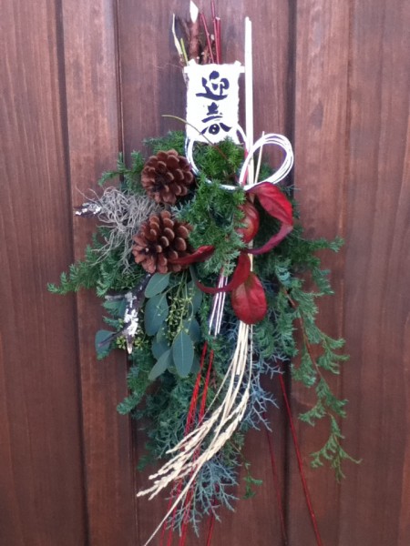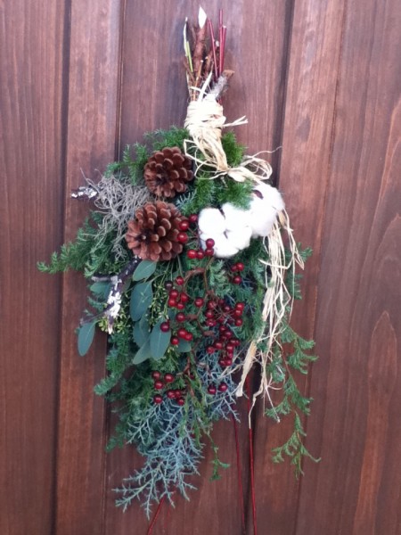クリスマスにはリースもいいけどスワッグもなかなか素敵です。ナチュラルな感じのスワッグ、リースよりも簡単に出来ます。もう少しクリスマス色を出したかったら、お家にあるオーナメントや唐辛子を入れるといいかもしれませんね。 クリスマスが済んだらパーツを少し変えるだけでお正月用のスワッグになります。 レッスン料は花材費込みで2800円(税抜)です。お正月用のオーナメントご希望の方は別に500円です。 こちらは比較的簡単に出来ますので、営業中のレッスンも承らせて頂きます。お時間、日程はお問い合わせください。 入れたいオーナメントなどありましたら是非ご持参ください。