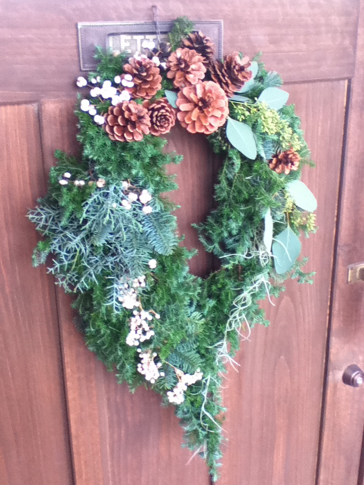少し円形を崩した感じのリースです。たくさんのグリーンと松ぼっくりのシンプルな造りです。クリスマスには赤やゴールドをプラスして、お正月には紅白のものや稲穂をプラスして、などアレンジが楽しめそうですね。
