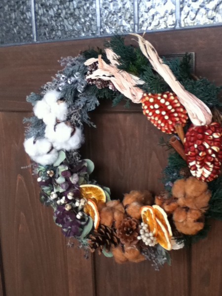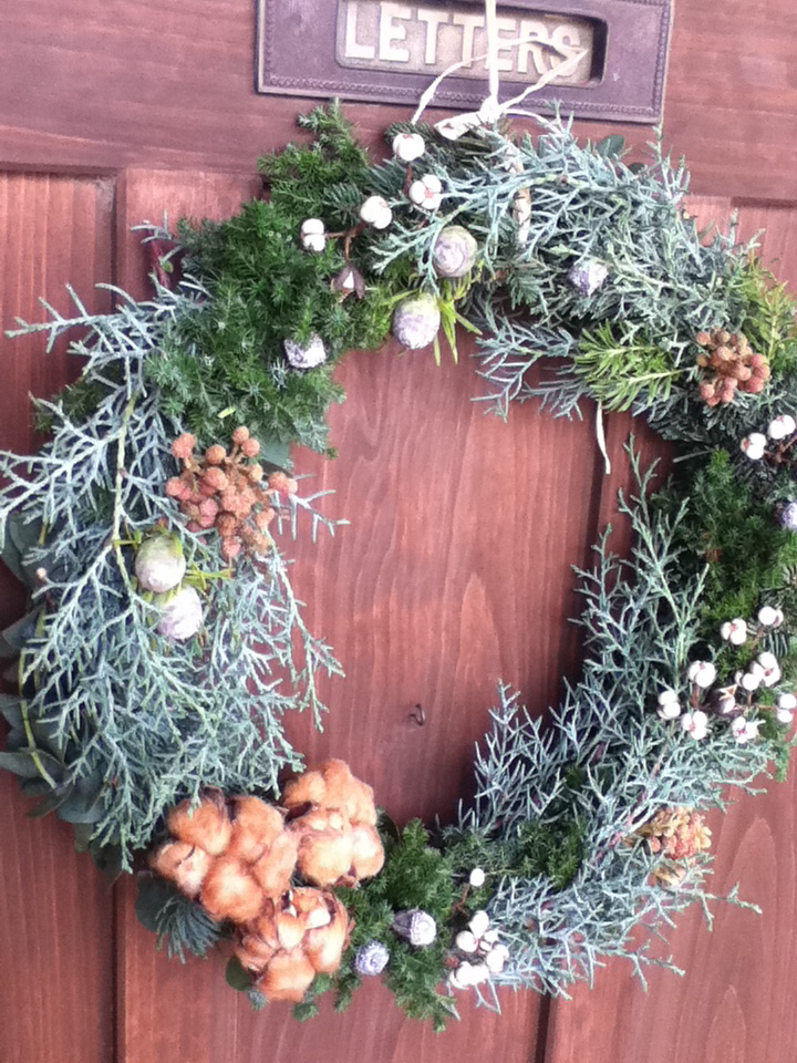冬の間飾っておけそうなグリーンと実だけのシンプルなリースです。 こちらはご近所のカフェにおさめさせて頂いたリースです。食べ物を扱われるところなのでそれを少し連想させるようなものをアレンジしてみました。
