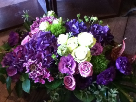 美容院の移転オープンのお祝いのお花です。送り主の方と相談して「紫とグリーンで」ということになりました。 開店のお祝いには華やかな色合いのものが多く届きます、その中でぐっと色を押さえると逆に目立つんです。紫好きの私の意向もすこーし入ってますが、お客様のご希望です。なかなか出来る決断ではありません、すぱっと決めていただいたそのお客様のセンスの良さ、かっこいいです。 お届けした美容院はおしゃれな外観、くつろげそうな内装の素敵なお店でした。