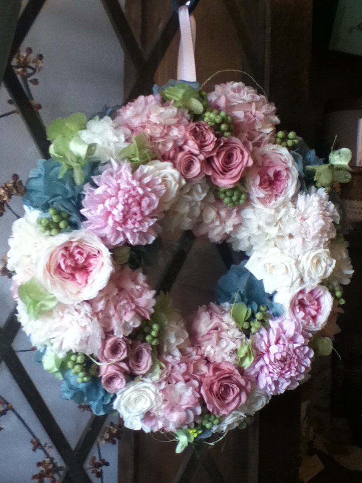 さて先週は東京まで「本気のプリザーブドフラワーレッスン」を受けに行ってきました!ずっと憧れていたコルロールさんのレッスンです。先生の作られるプリザーブドフラワーのアレンジは本当に素敵で「生花好きの人をもうならせる」ぐらい、奥行きと透明感があるものです。今回は2回めのレッスンでリースを作ってきました(↑写真)。私が考えていた以上に花の種類も量も多く使用します。時間内にワイヤリングをすることに必死であまり余裕がありませんでした。でも素敵な花材を用意しておいて頂けたおかげで満足の出来です!