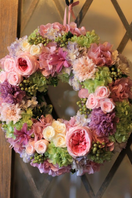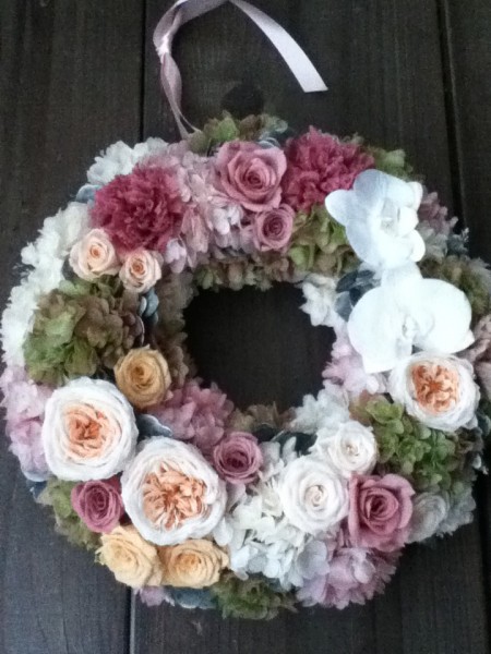 今年はプリザーブドフラワーのレッスンを受けてプリザーブドに対する考え方も見方も変わりました。生花が好きな人は大抵プリザーブドフラワーのことをそんなに好きでないものですが、須田先生のレッスンで私は変わりました。生花が使えないところにも飾っていただけるのは、プリザーブドの一番の魅力です。重いものがかけられないところにリースを飾りたい、とか生花が禁止されているところへお見舞いに持っていきたい、とか留守がちで生花の面倒は見られない、とか。造花にありがちなプラスッチックな感じや、ドライフラワーにありがちなカサカサ感ではなく、まるで生花のような深みのあるものをプリザーブドは作り出せるんだとと開眼させて頂いた夏でした。