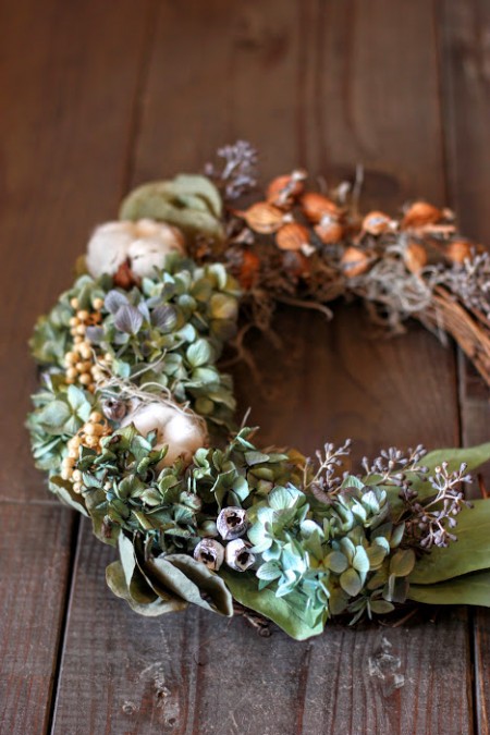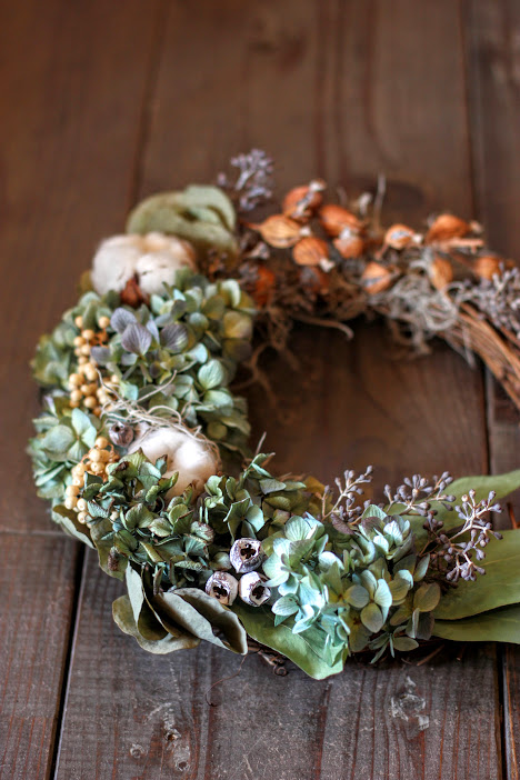 こちらの写真がbefore、せっかくのリースがなんとなくぼや〜っとしてます。 そしてこれがafter。構図といい明るさといい、まるで別物のようです。恐るべし、フォトレッスン。写真でご自分の作品を見せる機会のある方、フォトレッスンおすすめします。 秋もやってきましたので実ものをたくさんつかったリースを作ってみました。リースを飾りたくなる季節になりましたね。