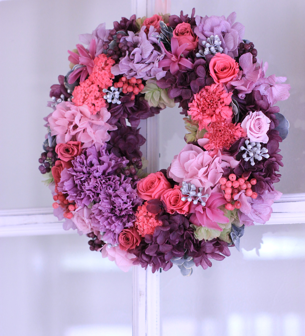 プリザーブドフラワーのリースです。 暑い時期にはやはりプリザーブドフラワーのご注文をたくさん頂きます。 プリザーブドフラワーは生のお花を美しいうちに摘み取り、薬品を使って水分を抜き、人工的に色づけしたものです。 技術の進歩により、以前より色んな種類、色が次々と発売されています。 生花に比べて価格は依然として高いですが、1年半から2年は美しい状態を保てること、水やりなどの手間がいらないこと、花粉症の方や生花禁止の病室でも飾って頂けることなどから人気は高まっています。