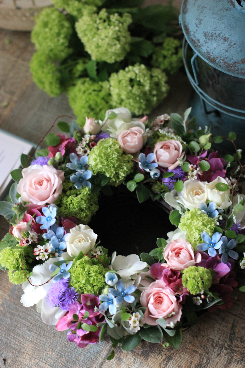 テーブルリースについてよくご質問頂きます。 「壁にかけることは出来ますか」「そのままドライになりますか」と。 残念ながらどちらも無理なんですー、ごめんなさい‼ テーブルリースはその名の通りテーブルに置いて愛でて頂くリースです。 水を含んだスポンジに花がさしてあるので傾けたり下げたりは出来ません。 でも短くさしてあるのでとてもよくもちます!これからの季節はまん中にキャンドルを置いたりして楽しまれてはいかがでしょうか?
