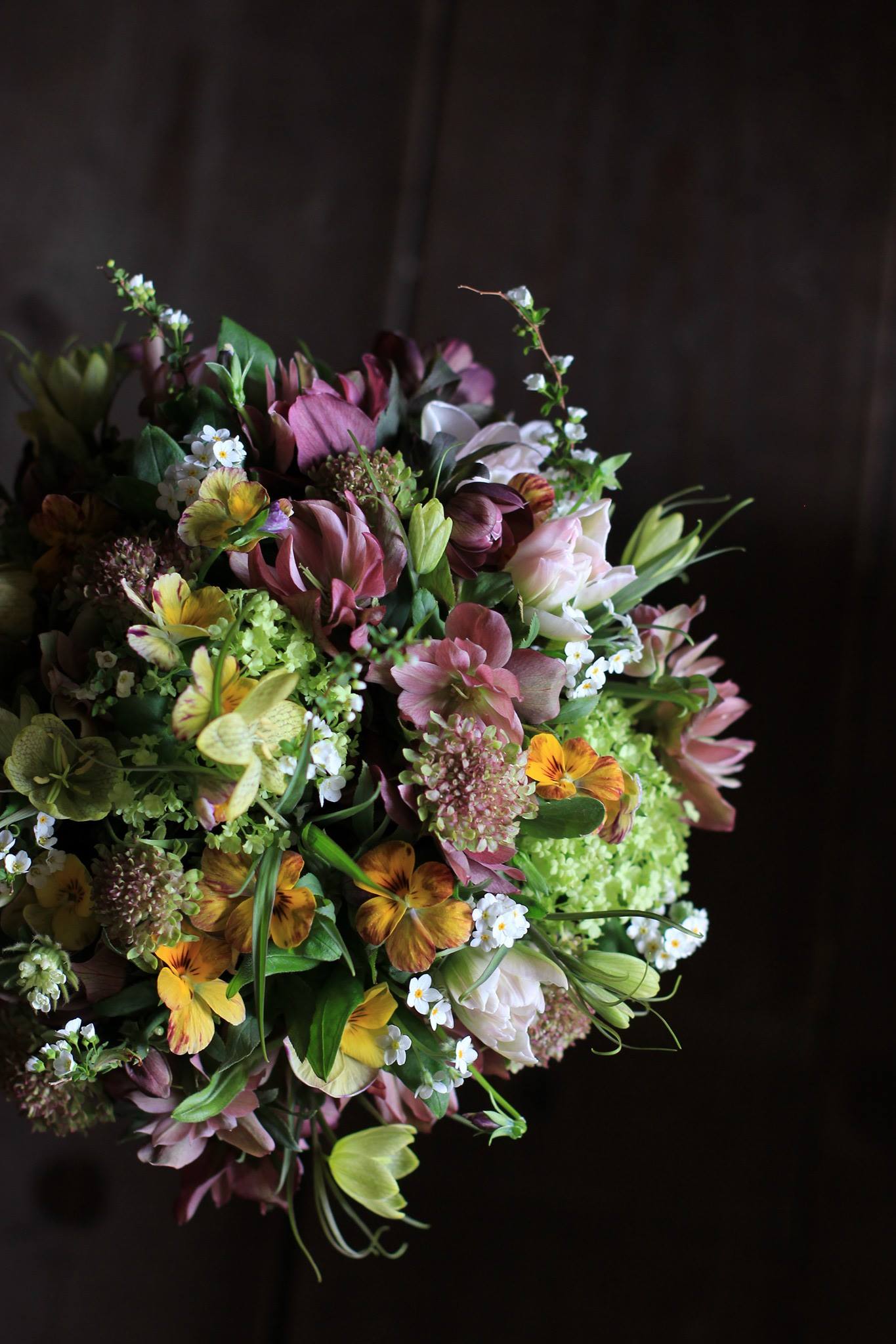 すっかり春の陽気ですね。 花屋では春の花(チューリップやラナンキュラス)とお別れして初夏の花へと移行します。 気温が低くてよくもった時期から花屋を悩ます高湿度と高温の季節へ。 がんばりますっ! 画像はバイモユリやパンジー、クリスマスローズが入ったブーケです。
